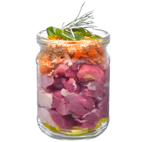 Composition: canard 66 %, bouillon 14 %, millet 8 %, carottes 4,3 %, pommes 2 %, minéraux 2 %, mélange de plantes (romarin, thym, souci, pissenlit) 1 %, huile de saumon 1 %, persil 1 %, graines de lin 0,5 %, algues et cassis 0,2 %.