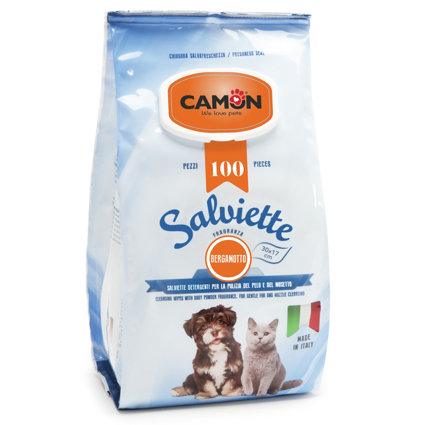Lingettes nettoyantes parfumées à la bergamote pour le pelage et le visage, grand format de 100 lingettes.