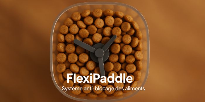 Pour une distribution sans accroc, le Nutribot Connect intègre la technologie FlexiPaddle™. Sa pale souple et amovible prévient efficacement les blocages de croquettes, quelle que soit leur forme ou leur taille. Simple à retirer et à nettoyer, elle garantit un fonctionnement fiable au quotidien et vous offre une sérénité totale : votre animal reçoit ses repas sans interruption, préservant ainsi son bien-être et sa routine alimentaire.