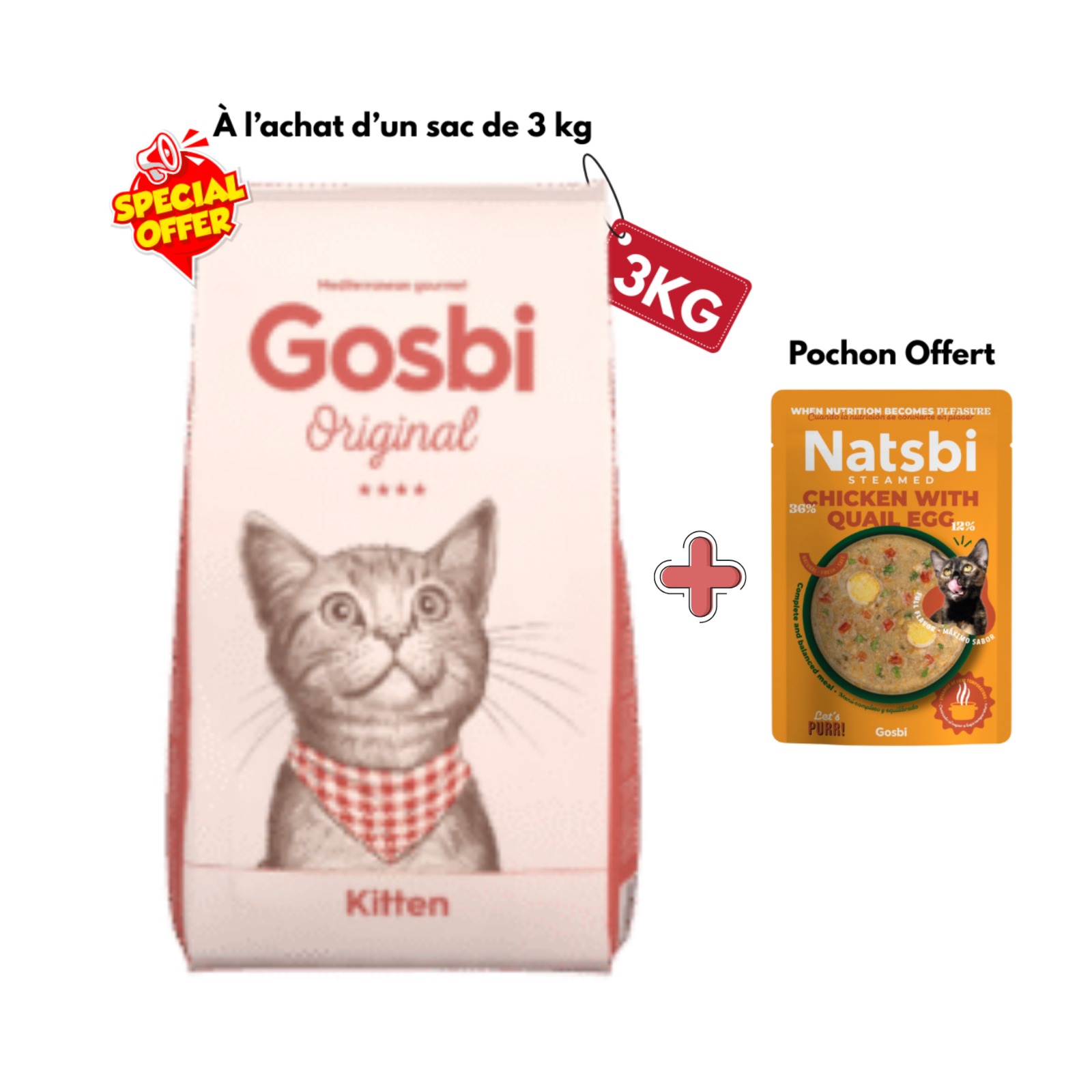 Gosbi Croquettes Original Chat Kitten ( 3kg ) + 1 Sachet Natsbi Offert