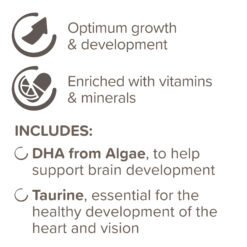 - VITAMINES ESSENTIELLES : Enrichi en vitamines et minéraux essentiels, tels que la taurine et le DHA (acide docosahexaénoïque), des acides aminés de qualité supérieure, dont l’efficacité est prouvée pour favoriser le développement cognitif et l’acuité visuelle. Pour une alimentation parfaitement équilibrée.