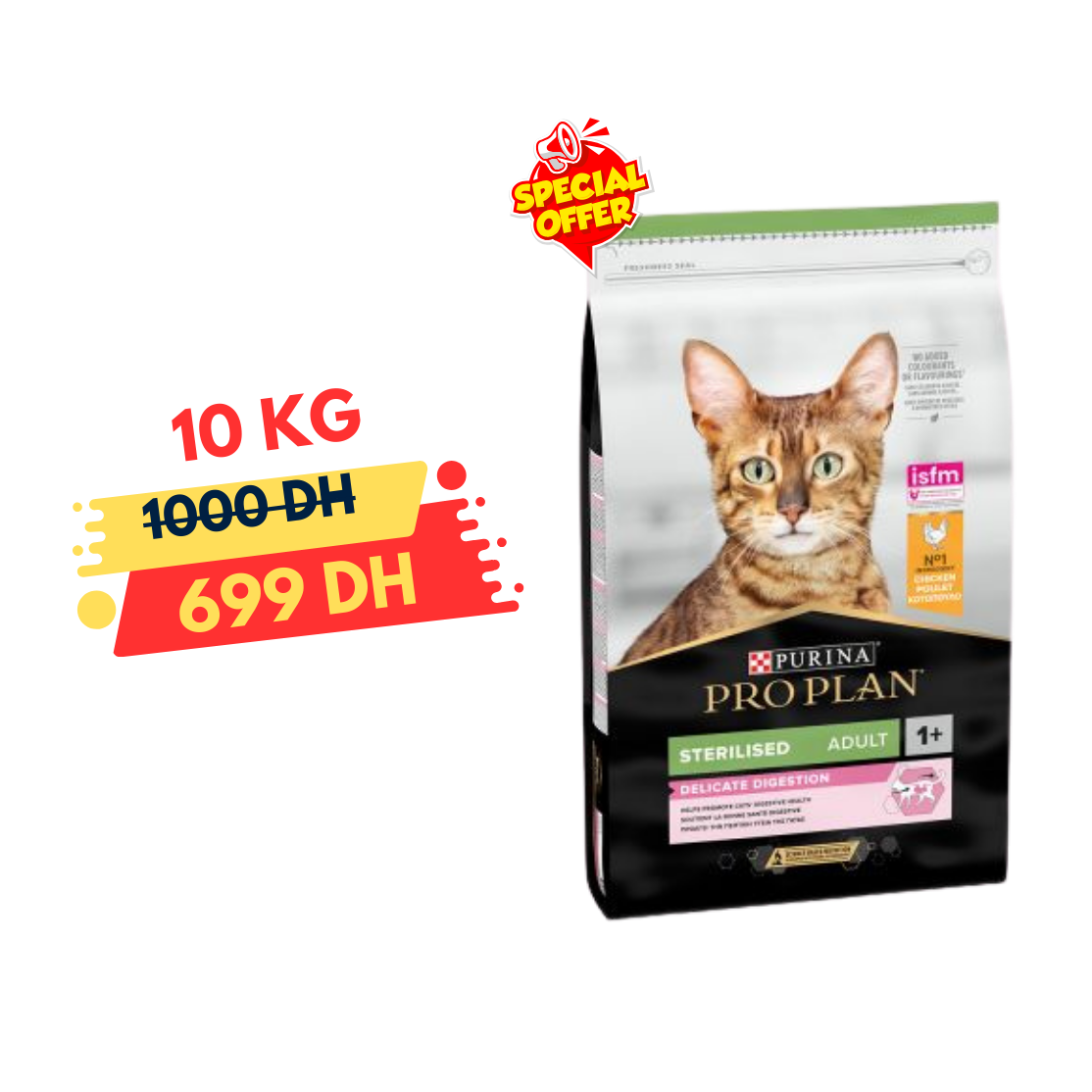 Les chats adultes stérilisés et castrés ont des besoins nutritionnels spécifiques qu’il est important de prendre en compte. Les croquettes PURINA PRO PLAN Sterilised Adult Delicate Digestion sont adaptées à leurs besoins et favorisent notamment le contrôle du poids. Les teneurs de nutriments et énergie sont adaptées et facilitent le maintien du poids de forme.
