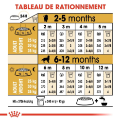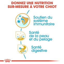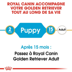 ROYAL CANIN® Golden Retriever Puppy est spécialement conçu pour répondre à tous les besoins nutritionnels de votre jeune Golden Retriever, et convient aux chiots de moins de 15 mois. Au cours de cette phase clé de croissance, le système immunitaire de votre chiot se développe peu à peu : c’est pourquoi ROYAL CANIN® Golden Retriever Puppy contient un complexe d’antioxydants afin de renforcer les défenses naturelles de votre chiot pour l’aider à rester en pleine santé pendant sa croissance. Grâce à sa formule exclusive, ROYAL CANIN® Golden Retriever Puppy préserve la santé de la peau et du pelage de votre jeune chien. Enrichie en acides gras oméga-3 EPA et DHA et en huile de bourrache, cette formule contribue notamment à renforcer le rôle de « barrière » de la peau. Pour favoriser la bonne santé digestive de votre chien, ROYAL CANIN® Golden Retriever Puppy contient un mélange de nutriments spécifiques comprenant des protéines et des prébiotiques de haute qualité. Ces nutriments agissent pour maintenir le bon équilibre de la flore intestinale, ce qui contribue à une bonne qualité des selles.