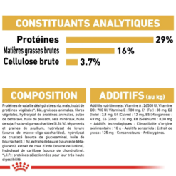 Constituants analytiques : Protéines : 29.0% – Teneur en matières grasses : 16.0% – Cendres brutes : 7.4% – Cellulose brute : 3.7%.