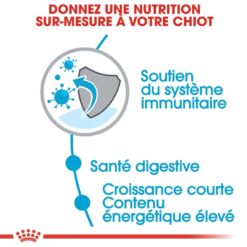 Soutien du système immunitaireLa croissance est une étape essentielle dans la vie de votre chien : c’est le moment des grands changements, des découvertes et des nouvelles rencontres. Durant cette période clé, le système immunitaire du chiot se construit progressivement. ROYAL CANIN® Medium Puppy aide à soutenir les défenses naturelles de votre chiot notamment grâce à un complexe d’antioxydants comprenant de la vitamine E.