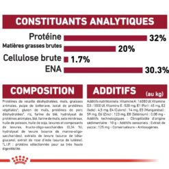Constituants analytiques : Protéine : 32 % – Teneur en matières grasses : 20 % – Cendres brutes : 8 % – Cellulose brute : 1,7 %.